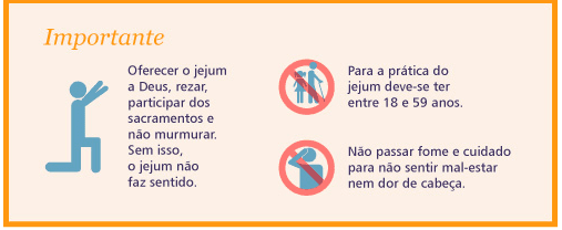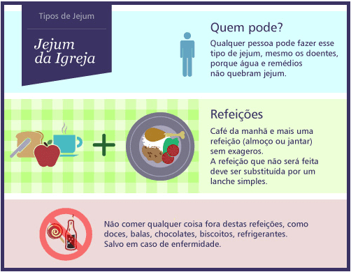 A lei do jejum “obriga a fazer uma única refeição durante o dia, mas não proíbe de consumir um pouco de comida de manhã e à noite, de acordo com a quantidade e qualidade aprovadas pelo costume local” (Paenitemini, III, IV 2/647). Esse é o chamado Jejum da Igreja, por ser extremamente simples, podendo ser feito por qualquer pessoa. Esse modo de jejuar vem da Tradição da Igreja e pode ser praticado por todos sem exceção. O básico desse tipo de jejum é que você tome o café da manhã normalmente e depois faça apenas uma refeição – almoçar ou jantar -, a depender dos seus hábitos, de sua saúde e de seu trabalho. A outra refeição, a que você não vai fazer, será substituída por um lanche simples, de acordo com as suas necessidades.